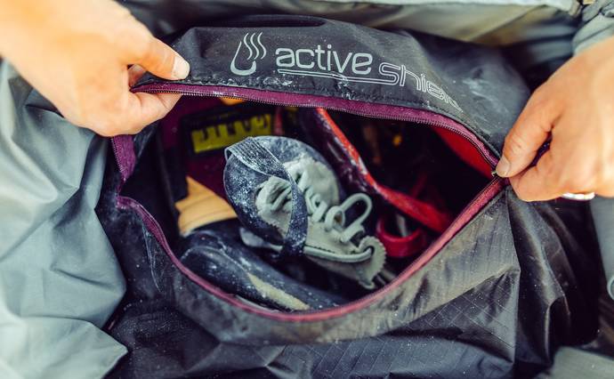 - ActiveShield zippered TPU coated compartment keeps dirty or wet clothing and gear separate for vapor, odor and dirt protection.