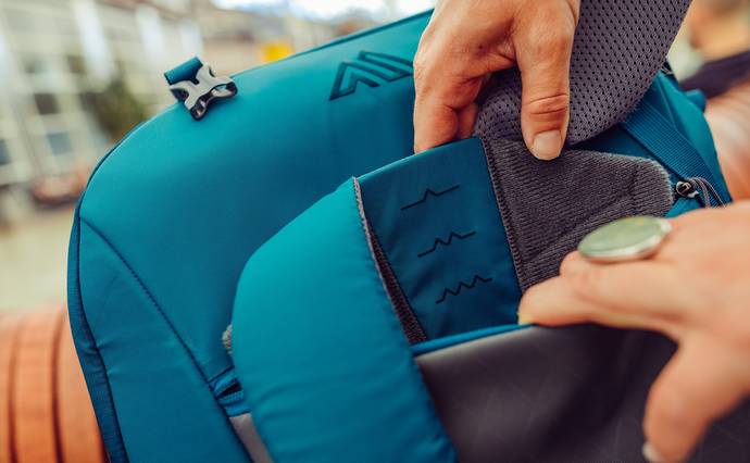 - Women's specific adjustable padded airmesh harness with sternum strap stows into a dedicated sleeve for air travel.