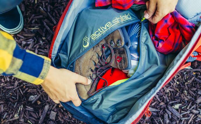 - ActiveShield zippered TPU coated compartment keeps dirty or wet clothing and gear separate for vapor, odor and dirt protection.